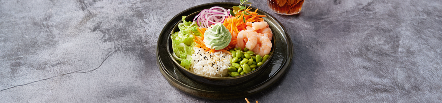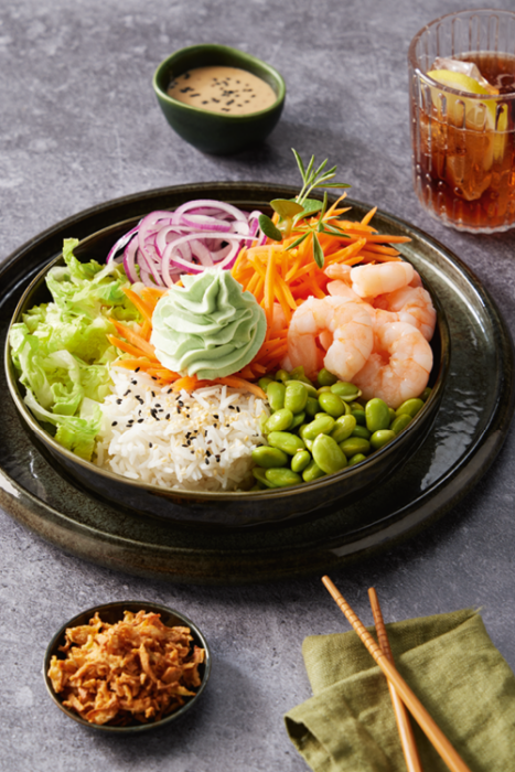 - Neem een Poke Bowl schaal en rangschik hierin de rijst, sla, rode ui, wortel, sojabonen en de garnalen.