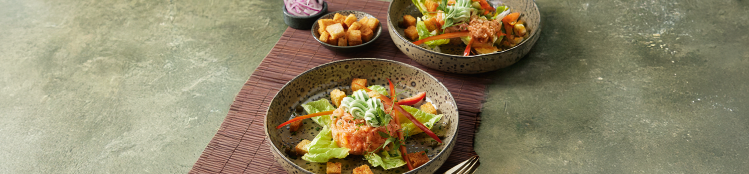 Salade met zalmtartaar en Lebo roomkaas Wasabi smaak